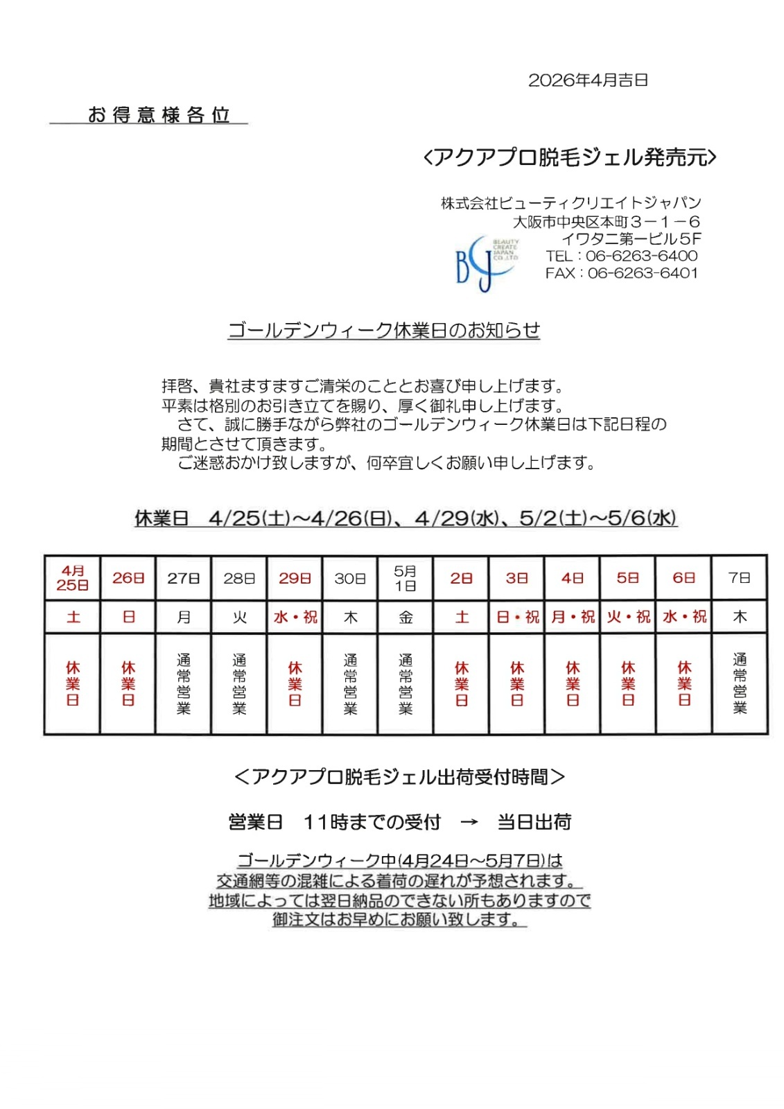 2026年GW休業日のお知らせ
